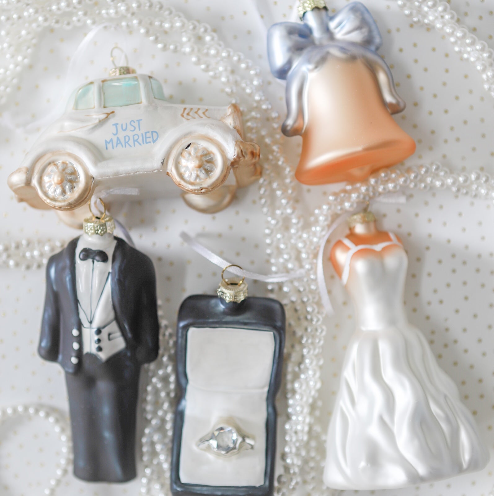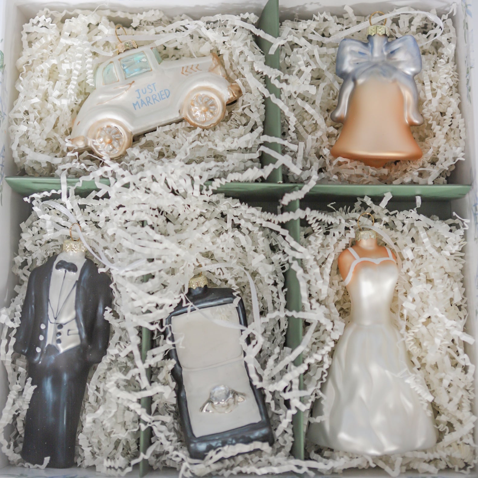 From the shimmering bridal gown to the “Just Married” car, every piece captures a chapter of love, joy, and new beginnings. Each set arrives beautifully packaged and ready to gift — perfect for a bridal shower, wedding, or a first married Christmas together.